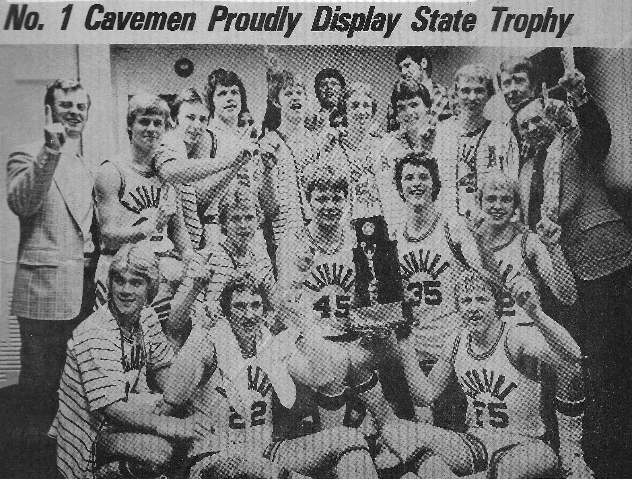 With gold trophy in hand at last, the Cavemen rode into the sunset. It was the school’s first hoops title since 1962, and the first after they had joined the “bigger school” ranks. Class 4A was as high as it went in those days and Class 3A wasn’t far behind in prominence.